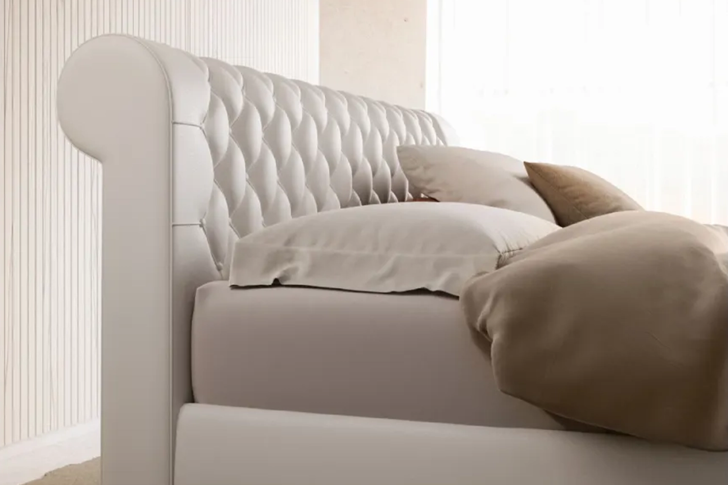 Scopri il letto Victoria, un elegante modello capitonné con testiera sagomata che fonde linee contemporanee e tradizionali. Personalizzabile con raffinata mantovana per il giroletto e disponibile con box contenitore, è la scelta ideale per una camera dallo stile classico e ricercato.